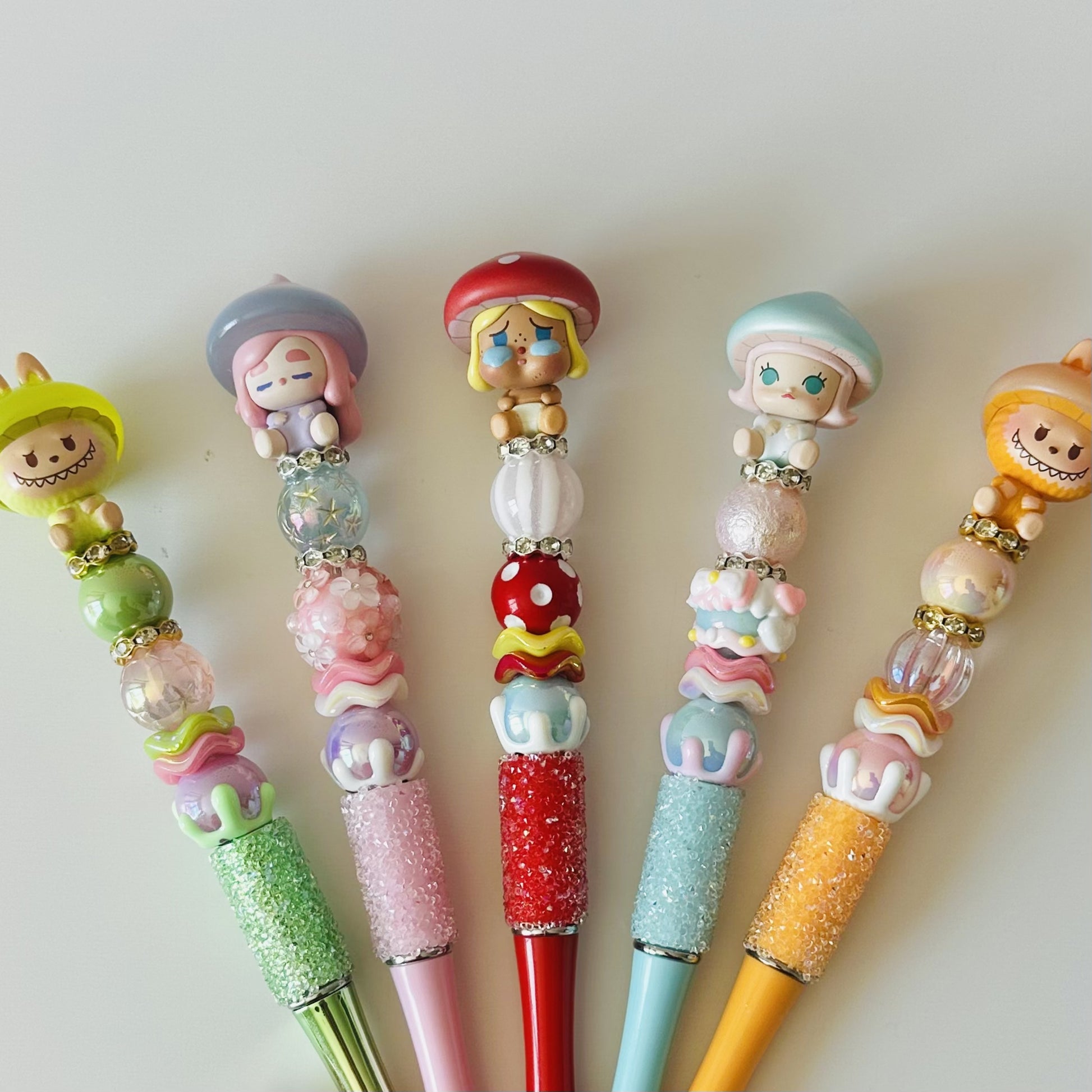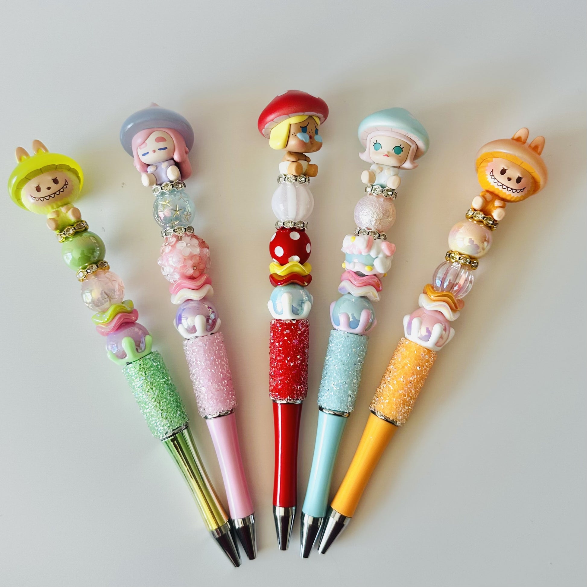 Each pen is a one-of-a-kind creation, handcrafted with care using sugar pens and high-quality beads. The design features authentic Mushroom series Pop Beans, making every piece unique, fun and collectible. Perfect for writing, gifting, or simply adding a little cuteness to your desk.